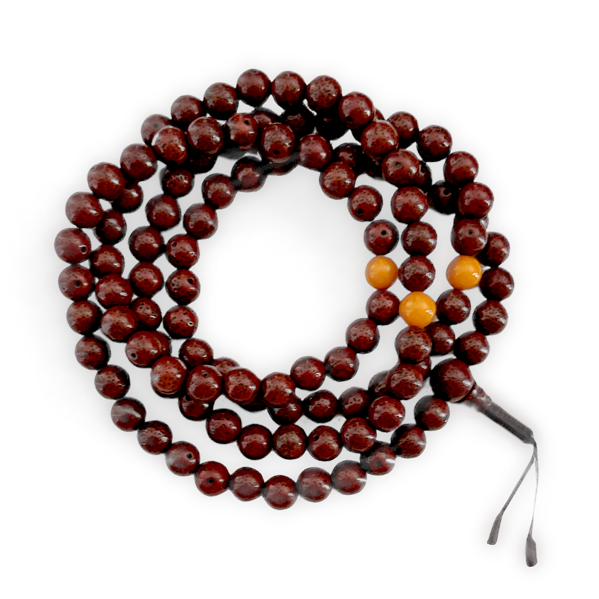 This traditional 108 bead mala is comprised of red stained lotus seed beads (approx. 7-8mm) and features amber quartz decorative spacer beads and a knotted tassel.